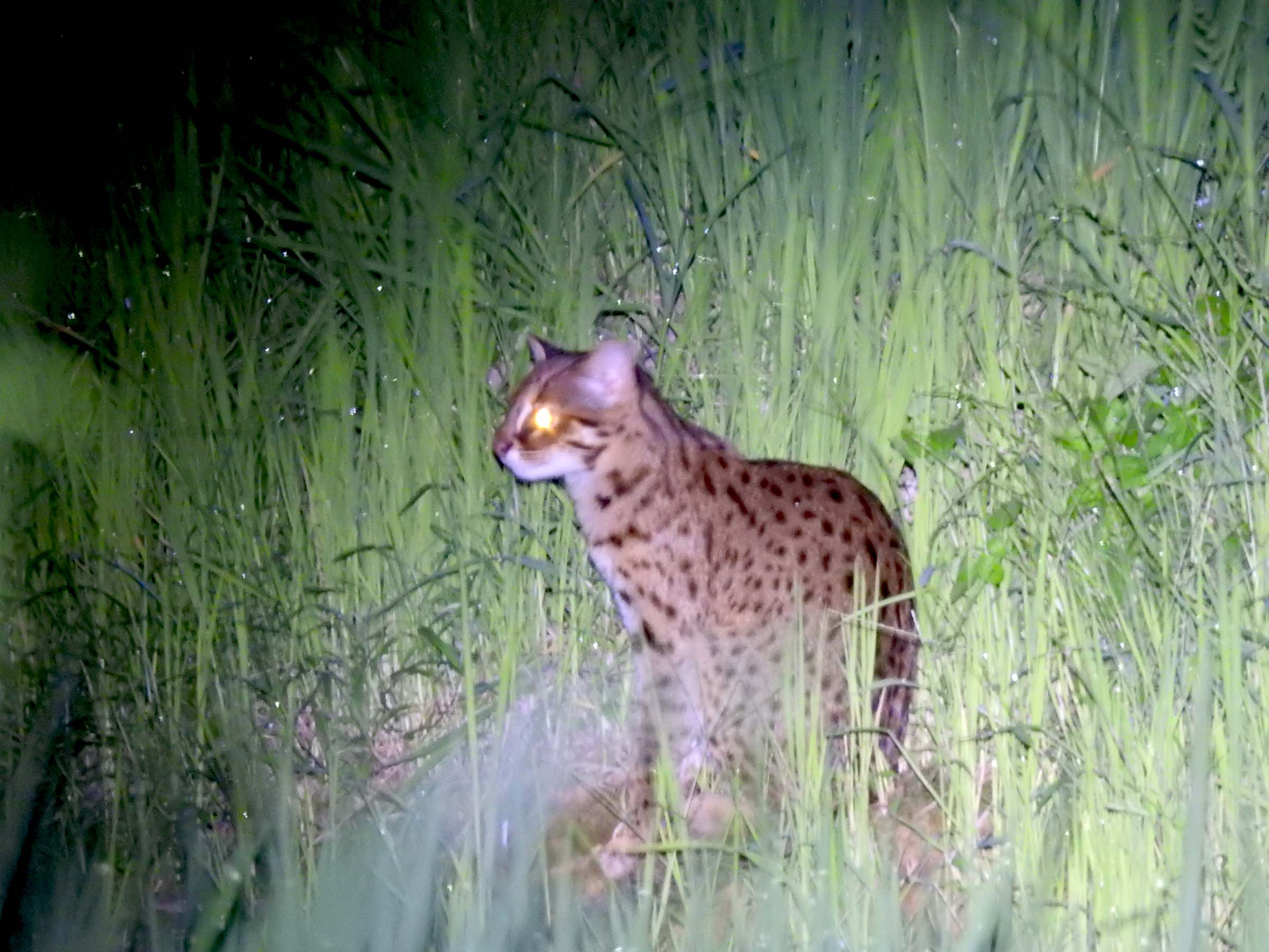 “Kami pakai metode line transect, jalan menyusuri jalur tertentu. Nah, ketika survei malam itu, kami melintasi batas kawasan. Di situ ketemu kucing kuwuk.”