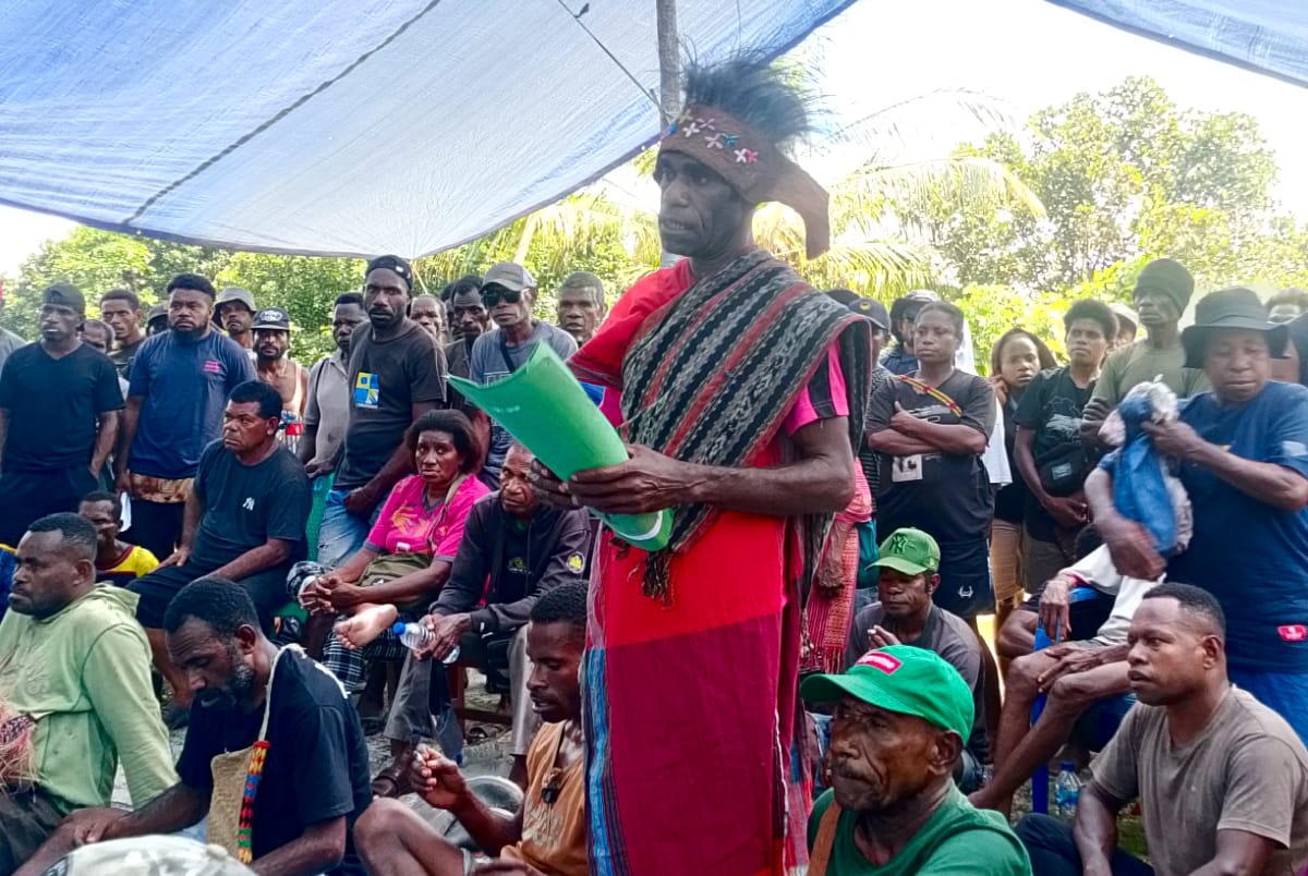 “Ini menyangkut hutan dan wilayah adat kami, jadi saya harus hadir. Saya berdiri bersama rakyat. Siapa pun yang berani masuk tanpa persetujuan adat, akan kami hadapi secara adat demi menjaga alam leluhur,” katanya di hadapan warga.