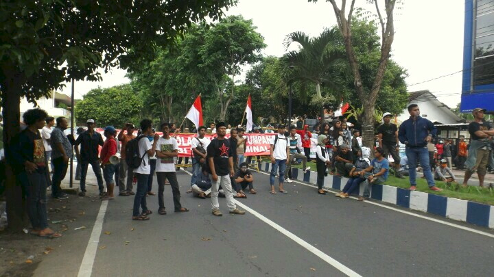 Spanduk itu dibentangkan sekitar empat orang. “Karyawan BSI Dilarang Lewat.” Begitu tulisan spanduk. Simbol palu arit terletak di pojok bawah. Dia bilang, spanduk terbentang di bahu jalan. Selain pasang spanduk, warga juga orasi dan menyanyi.