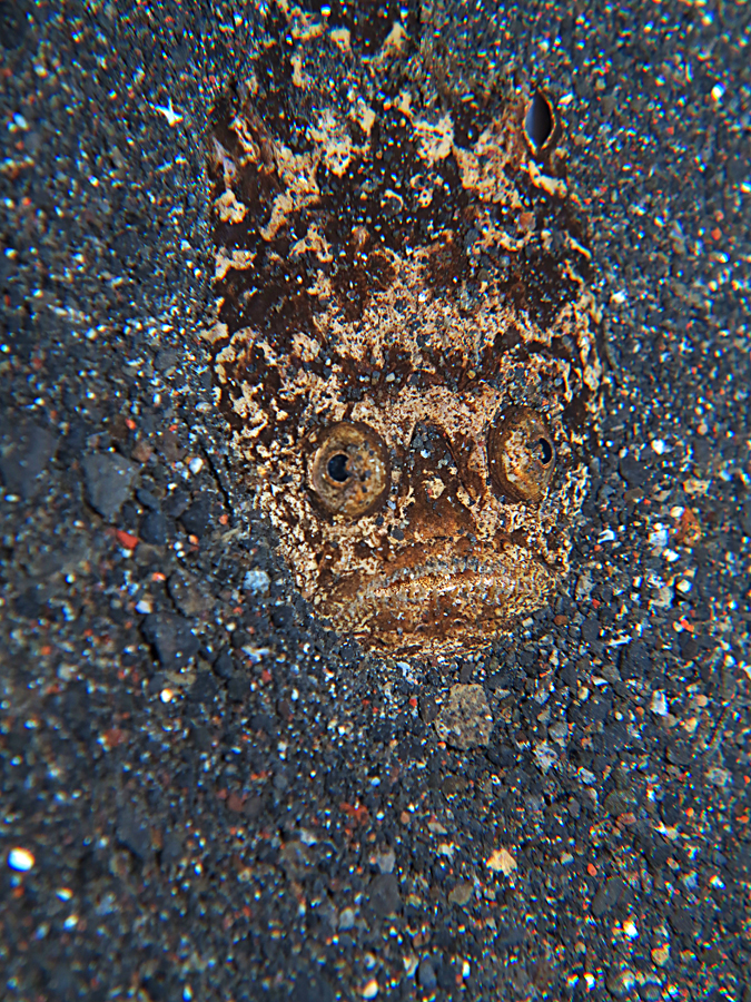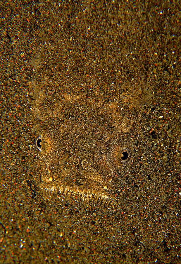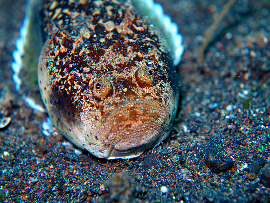 Saya sendiri baru menemukannya setahun yang lalu, di Selat Lembeh, Sulawesi Utara. Itu pun secara tidak sengaja. Ketika saya menyisir pasir hitam yang menjadi karakter dasar air Selat Lembeh, saya melihat satu seringai yang terlukis di permukaan pasir. Hati saya pun berdebar cukup kencang, dalam pikiran saya, saya sudah membayangkan bahwa ini adalah hewan yang saya sudah tunggu-tunggu untuk saya potret.