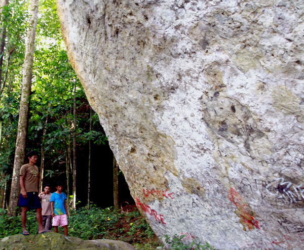 Sebuah batu besar sebagaimana digambarkan gedung bertingkat lima telah menanti kami. Tampak sebuah celah di bagian bawahnya yang merupakan pintu masuk yang biasa digunakan warga. “Inilah Batu Kuyu. Lewat celah tersebut, kita akan naik ke atasnya. Di atas batu ini ada sebuah gua. Kami yakin ini merupakan gua yang dijadikan tempat berlindung leluhur dahulu,” tukas Ason.