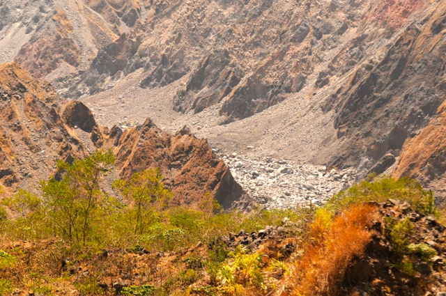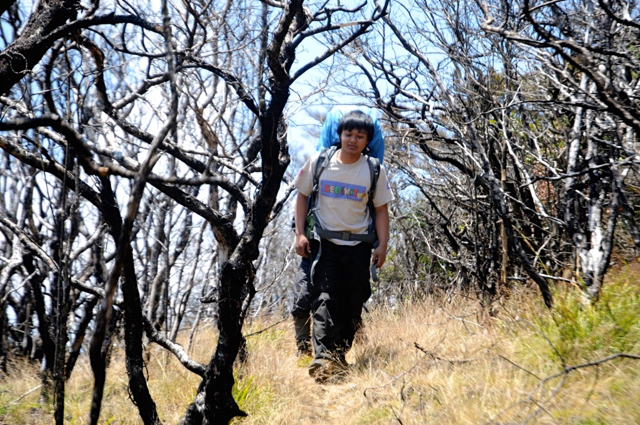 Di Pos V, kami memandang jalur pendakaian menuju Pos VI yang penuh bebatuan. Tanah tak terlihat. Kebakaran beberapa tahun lalu membuat penanjakan bertambah sulit. “Bayangkan kalau hujan, air jalur ini pasti deras seperti air terjun,” kata Akbar.