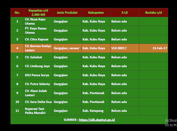 Hasil penelusuran EoFJaringan Kalimantan Barat, dari 11 industri hilir yang tersebar di Kabupaten Kubu Raya, Ketapang, dan Mempawah, hanya satu perusahaan yang mengantongi Sertifikat Legalitas Kayu.