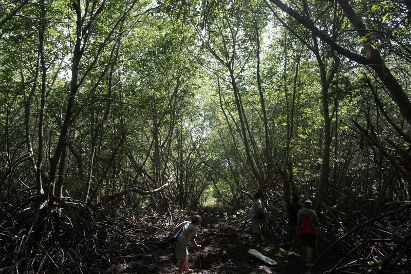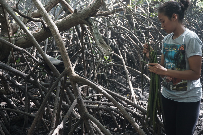 Lumpur cukup tebal menyambut mereka. Buah-buah bakau yang mirip kacang panjang namun lebih gemuk ini dipungut di antara akar bakau yang mencuat di sana sini. Mereka memungut buah yang kondisinya baik, tak busuk atau rusak tercabik-cabik kepiting.