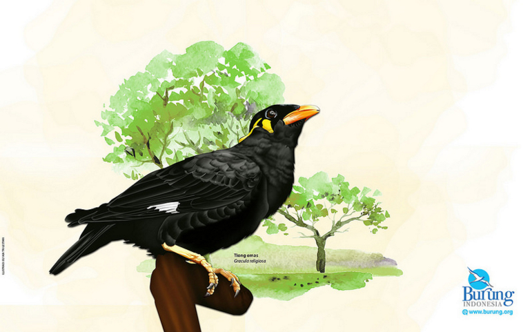 Inilah salah satu burung yang paling dikenal oleh publik. Di Indonesia, burung sejenis jalak berwarna hitam berkilau dengan piala kuning di kepalanya ini umum dijumpai di hutan dataran rendah Sumatera dan Kalimantan, termasuk pulau-pulau kecil di sekitarnya hingga ke Nusa Tenggara. Burung ini digemari karena mampu menirukan suara manusia.