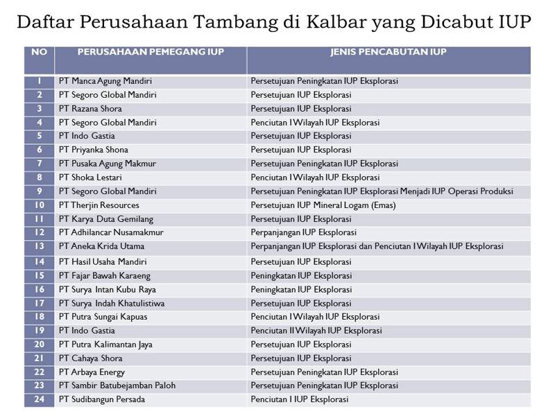 Maka, kata Wawan, pemerintah provinsi harus secara terbuka dan transparan menunjukkan izin-izin yang telah dicabut tersebut, berapa luasannya, dimana saja, dan dikeluarkan oleh siapa saja. Termasuk, bagaimana izin yang dikeluarkan oleh gubernur setelah UU No 23 tahun 2014. Wawan merujuk pada kasus PT. Teluk Batang Mitra Sejati, di Kecamatan Teluk Batang Selatan dan Alur Bandung, Kabupaten Kayong Utara.