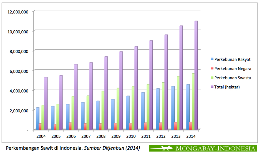 Data Kementerian Pertanian dan Gabungan Pengusaha Kelapa Sawit Indonesia (GAPKI), merilis dari sekitar 10,4 juta hektar lahan sawit di Indonesia, maka pada 2014 produksi sawit Indonesia adalah sebesar 31, 5 juta ton, dan terus mengalami kenaikan di 2015 menjadi 32,5 juta ton. Adapun 81 persen produk ditujukan untuk ekspor.