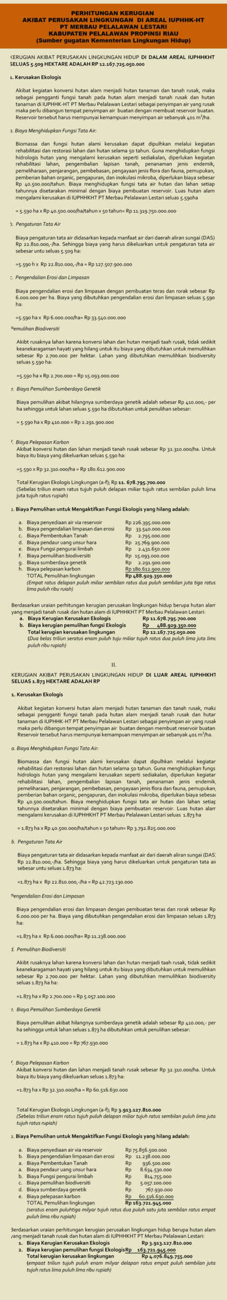 Kerusakan lingkungan dari pembalakan liar dalam konsesi seluas 5.590 hektar Rp12.167.725.050.000. Sedangkan, kerugian negara di luar izin konsesi seluas 1.873 hektar Rp 4.076.849.755.000.
