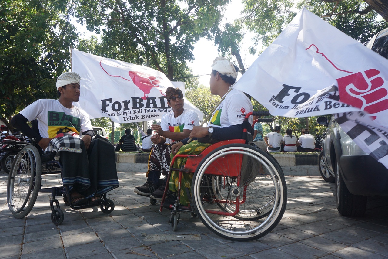 Hal ini terangkum dalam aksi longmarch oleh Forum Rakyat Bali Tolak Reklamasi Teluk Benoa (ForBALI), Kamis siang (23/2) di pusat pemerintahan Provinsi Bali, Renon, Denpasar.