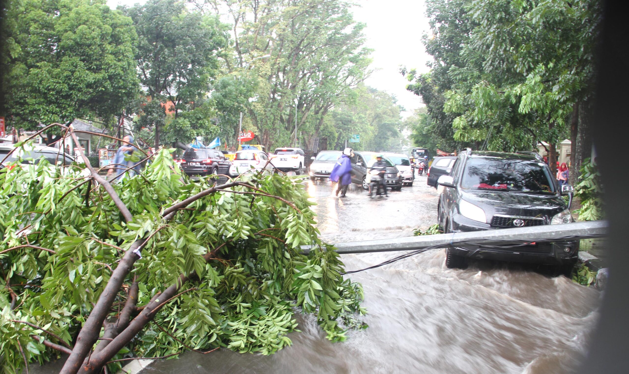 Dari pantauan Mongabay, pohon tumbang menimpa dua buah mobil yang sedang terparkir di samping Kantor Pengadilan Tata Usaha Negara (PTUN) Kota Bandung. Terjadi kepadatan lalu lintas karena terjadi banjir dari Sungai Cileuncang.