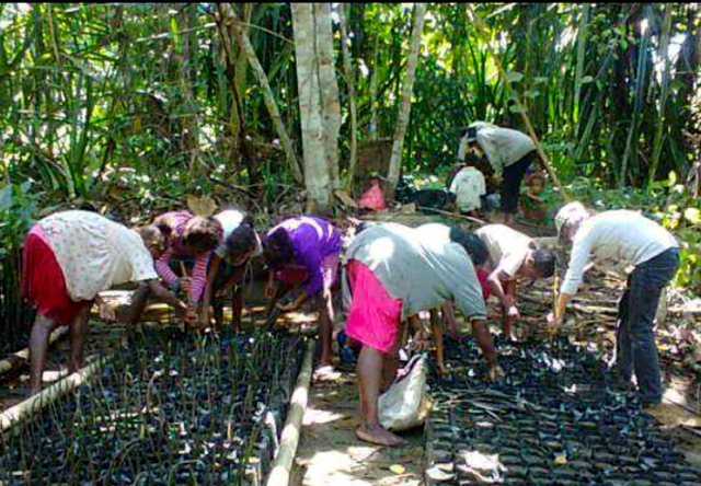 Akhirnya pekerjaan dimulai pada Maret 2013. Tiap pagi, selepas menyiapkan sarapan keluarga dan membereskan pekerjaan rumah, mereka berjalan kaki ke hutan Mangrove berjarak sekitar satu kilometer dari kampung. Mencari bibit mangrove jatuh dari pohon induk. Bibit-bibit dikumpulkan di pinggir hutan. “Pekerjaan itu kami lakukan tiga kali seminggu,” katanya.