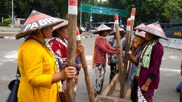 Ngadinah juga datang ke Jakarta, membawa lesung peringatan bahaya. ”Memukul lesung itu maknanya membunyikan tanda bahaya akan kehadiran pabrik semen,” kata warga Kecamatan Tambakromo, Pati ini.