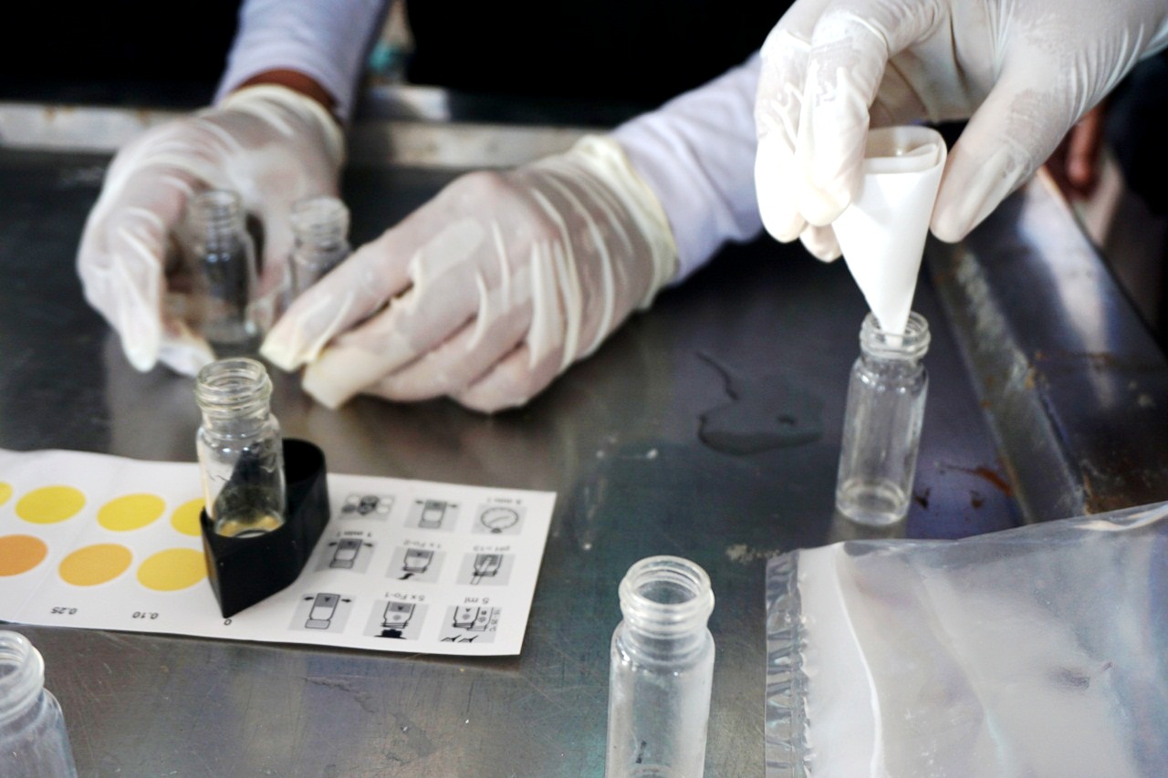 Sampel-sampel ini hanya digunakan sedikit saja untuk diuji. Digunting sekitar seujung jari, ukuran tiap sampel sama dengan ditimbang terlebih dahulu. Kemudian dimasukkan wadah plastik, diisi air murni dan dimasukkan mesin penghancur agar cairannya bisa dijadikan materi uji.