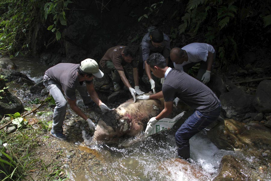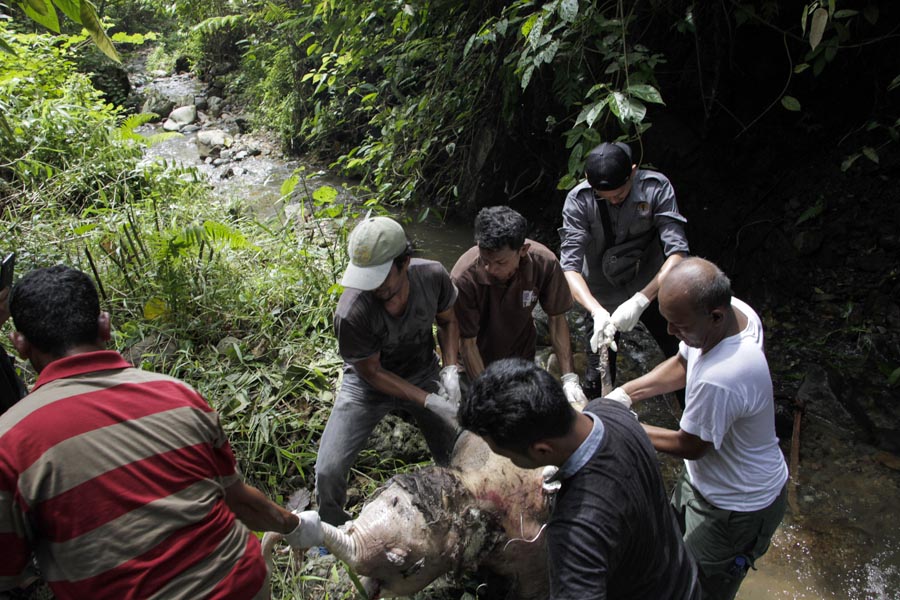 “Bayi gajah ini juga tidak mungkin mati karena racun. Dia masih menyusui dan belum makan makanan lain. Kami perkirakan, mati karena jatuh ke sungai saat berjalan dengan induknnya,” ujar Nurdin yang memeriksa secara detil, meski bangkai itu telah mengeluarkan bau menyengat.
