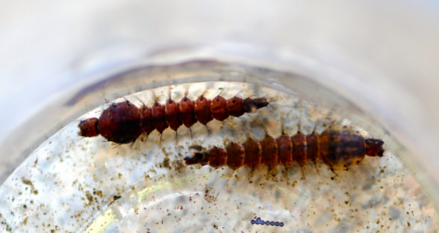Dari ban bekas itu, kami beralih ke temuan tim lain. Ada dua jentik nyamuk besar. Menyeramkan. Kepala besar dengan ujung meruncing. Badan seperti punya lipatan. Di setiap lipatan itu ada bulu keluar. Warna coklat. Inilah jentik nyamuk Toxorhynchites. Jenis nyamuk besar, tetapi tak menghisap darah manusia.