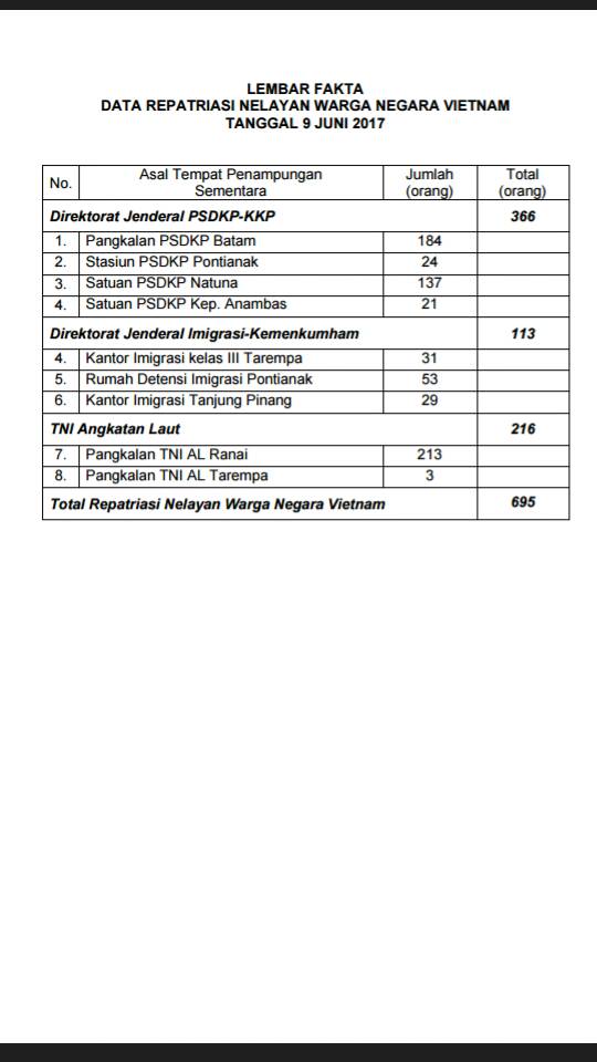Pemerintah Indonesia kembali memulangkan (repatriasi) nelayan berkebangsaan Vietnam yang ditangkap dalam berbagai operasi pemberantasan kegiatan penangkapan ikan secara ilegal di perairan Indonesia. Mereka yang dipulangkan tersebut jumlahnya sebanyak 695 orang. Nelayan-nelayan yang berstatus saksi tersebut dipulangkan melalu Batam, Kepulauan Riau.