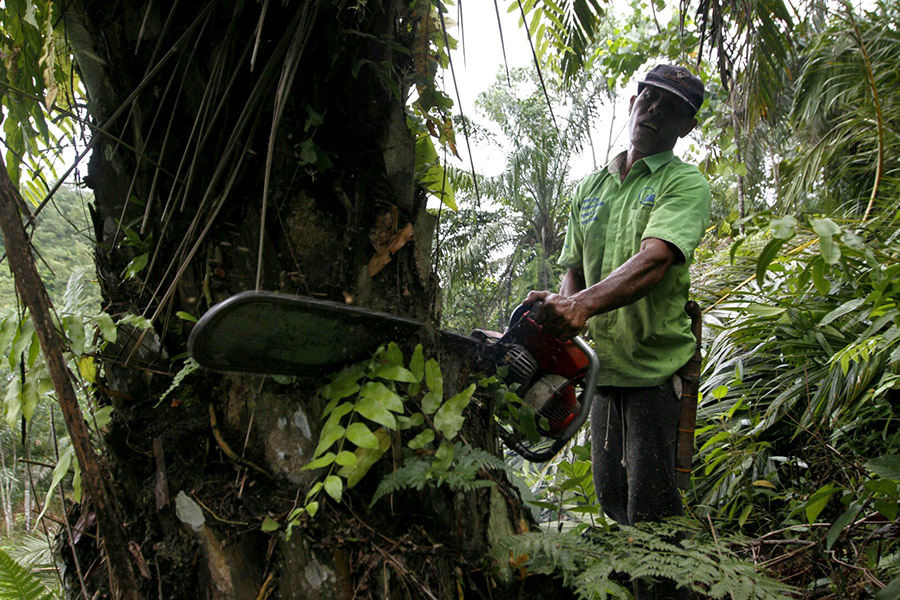 Jerit chainsaw itu memecah kesunyian. Meraung sejadinya. Memenggal batang-batang sawit yang tegak menjulang. Di tangan pemiliknya, Suparman, mesin berbobot 18 kilogram itu, adalah “pembunuh” nomor satu pepohonan monokultur ilegal yang tumbuh besar di dalam hutan lindung.