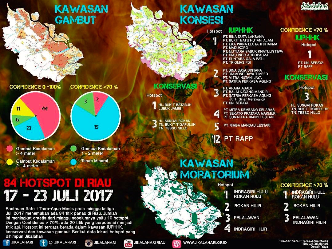 Woro Supartinah, Koordiantor Jaringan Kerja Penyelamat Hutan Riau (Jikalahari) menyatakan, analisa titik api menggunakan satelit Terra-Aqua Modis, terdapat 84 titik api selama 17-23 Juli. Ada 21 konsesi perusahaan HTI bertitik api.