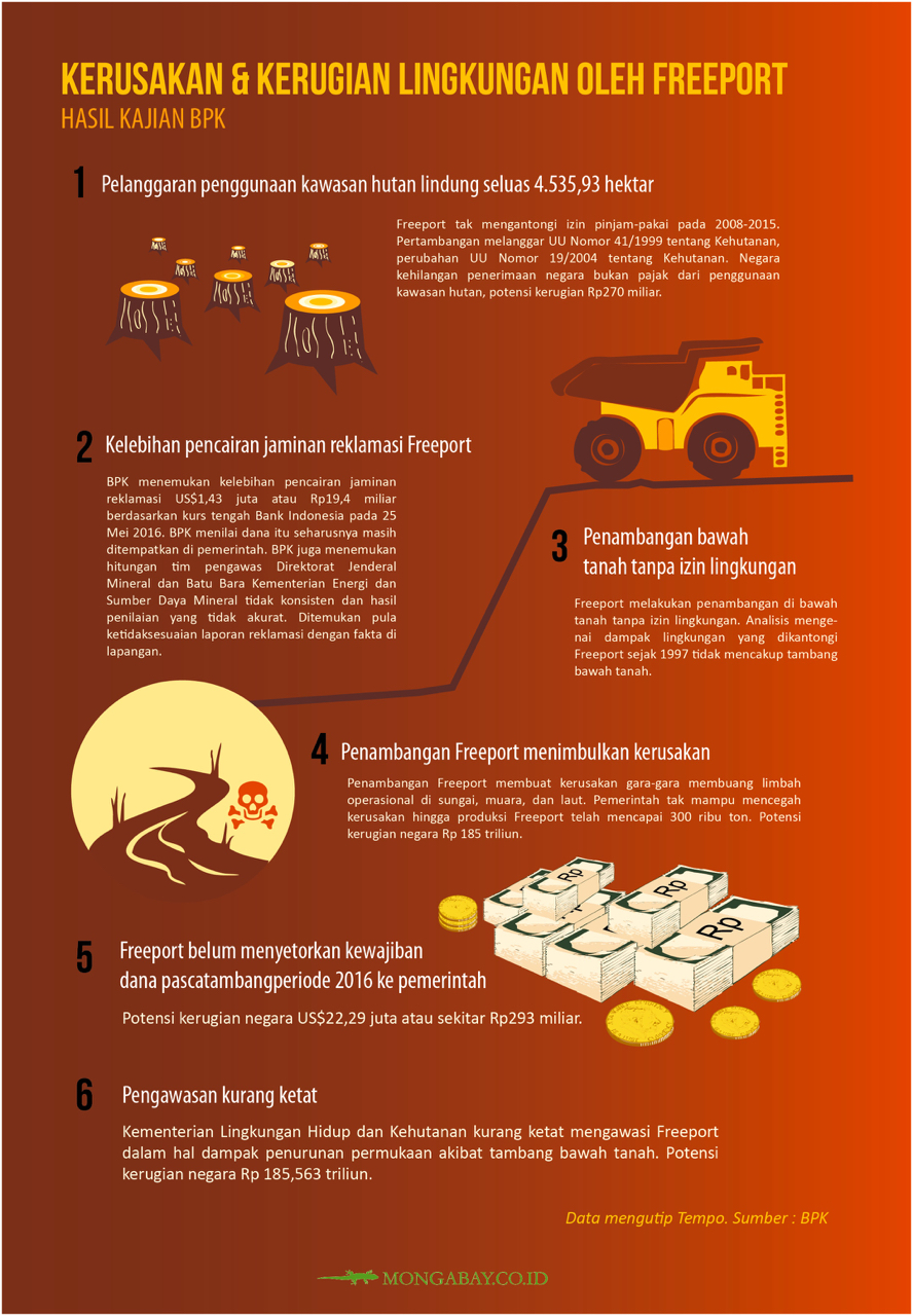 Minimal, menurut Badan Pemeriksa Keuangan (BPK) ada enam pelanggaran lingkungan yang dilakukan Freeport, yakni penggunaan kawasan hutan lindung, kelebihan pencairan jaminan reklamasi, penambangan bawah tanah tanpa izin lingkungan, kerusakan karena pembuangan limbah di sungai, muara dan laut, hutang kewajiban dana pascatambang dan penurunan permukaan akibat tambang bawah tanah. BPK menghitung potensi kerugian negara oleh Freeport senilai Rp185,563 triliun.