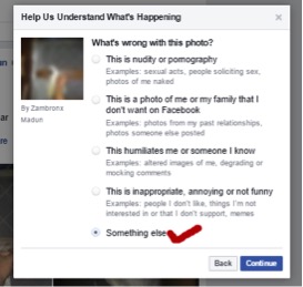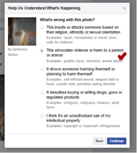 6. Berikutnya pilih opsi “This advocates violence or harm to a person or animal”, lalu klik “Continue”