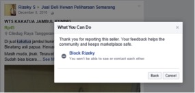 3. Setelah itu akan muncul notifikasi, Anda berhasil melaporkan adanya perdagangan satwa melalui Facebook. Selain itu ada opsi untuk pemblokiran akun seller, jika Anda tidak ingin melihat postingan seller tersebut, Anda bisa lakukan pemblokiran dengan cara klik “ Block —–“