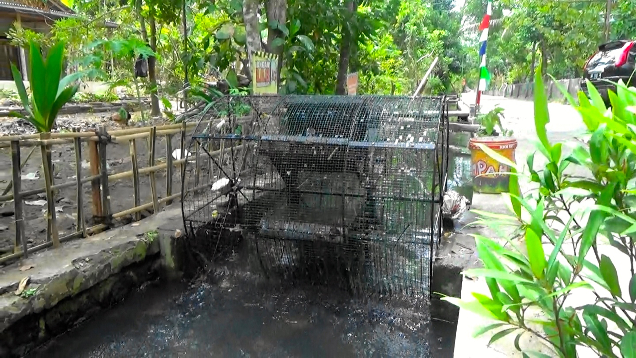 “Tujuannya agar sampah kecil tetap bisa hanyut, sementara ikan tidak,” kata Mutohar. Dia bersama pemuda desa membuat kincir dari bahan-bahan bekas.