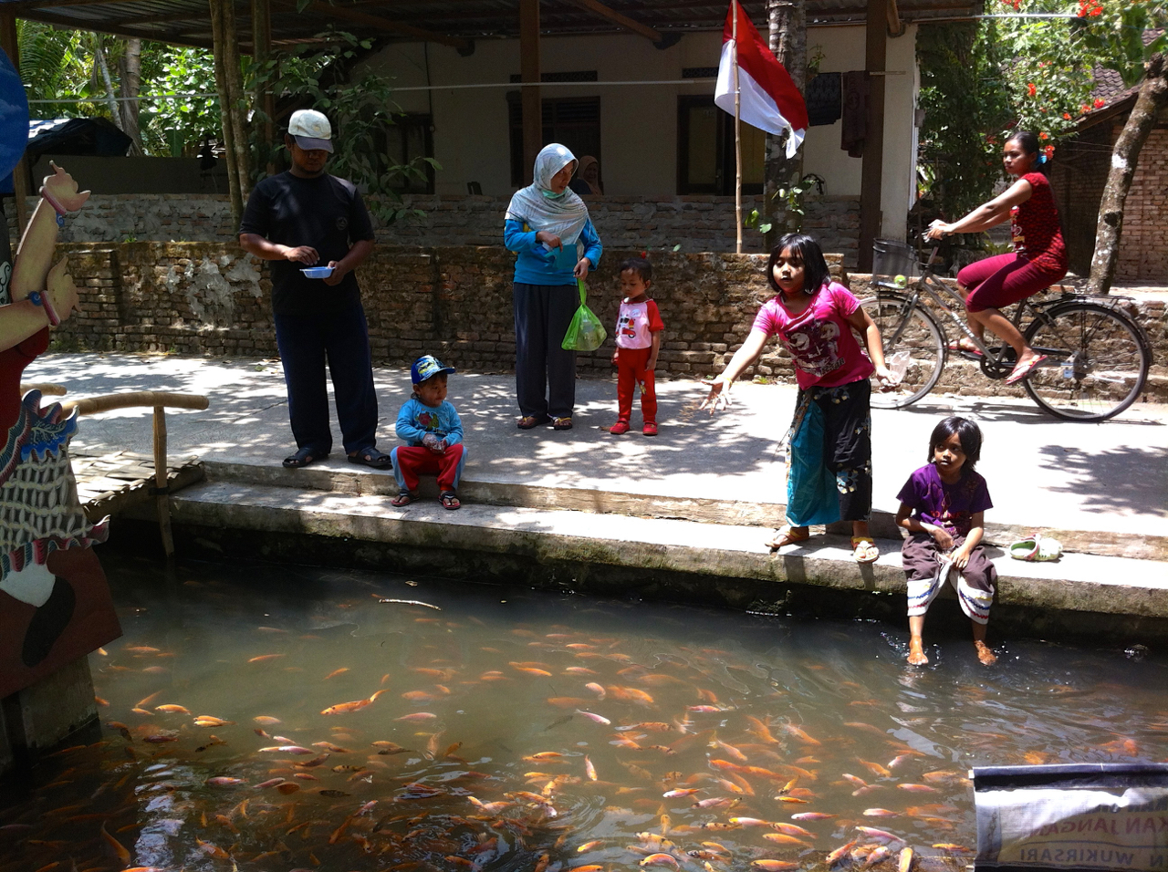 Nenek Warsiah, warga Dusun Singosaren, Desa Wukirsari, Imogiri, Bantul, Yogyakarta, perlahan membimbing cucu memasukkan uang ke kaleng. Sebungkus pelet makanan ikan tersedia di toples dia jumput.