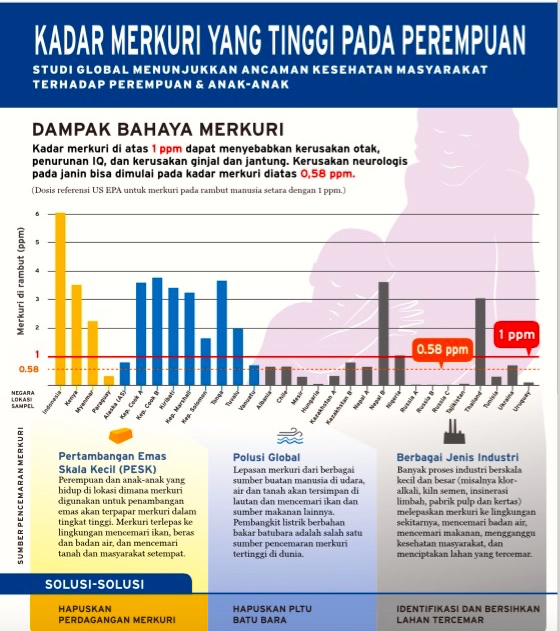 Hasil rata-rata kadar merkuri pada perempuan di Indonesia tertinggi dibandingkan negara lain. Indonesia menduduki urutan pertama, diikuti Myanmar 93% dan Kenya 44%. Paparan merkuri tak hanya dari pertambangan emas juga PLTU alias pembangkit listrik batubara dan industri semen.