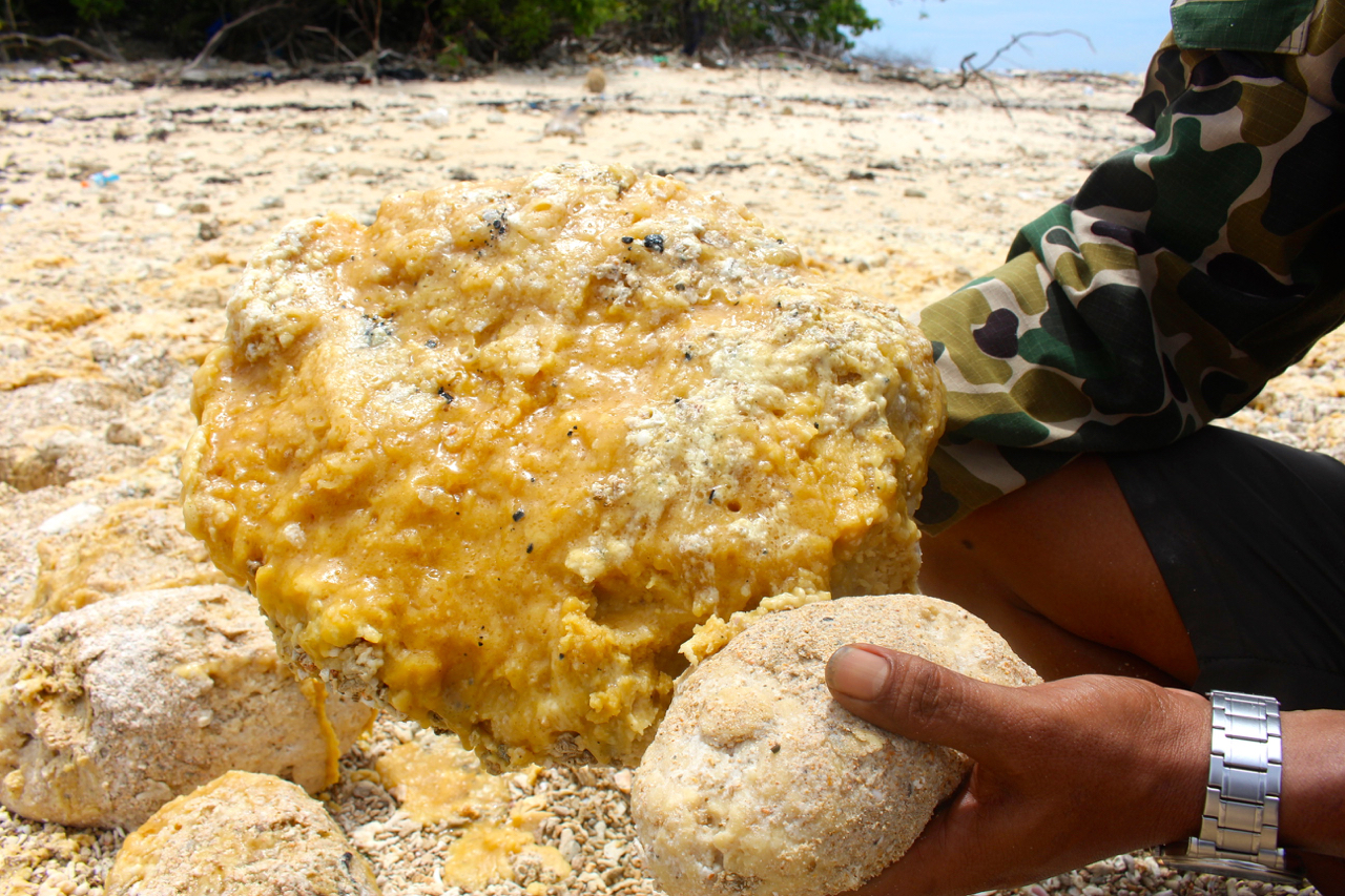 Berdasarkan pantauan Mongabay, Sinyaru dan Kasiak, paling banyak terpapar. Saat memasuki pulau, bongkahan ini menyerupai terumbu karang berbentuk bulat berwarna kuning dan berongga namun setelah diinjak tekstur lengket dan licin seperti mentega.
