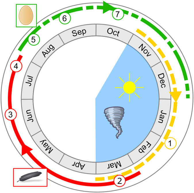 Bagaimana dengan keterangan garis hijau? Warna ini mengindikasikan bila dodo masuk dalam periode berbiak. Angka (1) terbentukanya LAGs, (2) dimulainya masa pergantian bulu, (3) tumbuhnya percampuran antara bulu halus (downy) dan bulu baru, (4) berakhirnya pergantian bulu, (5) waktu berbiak untuk individu betina, (6) Telur dierami, dan (7) individu muda mulai tumbuh dan berkembang.