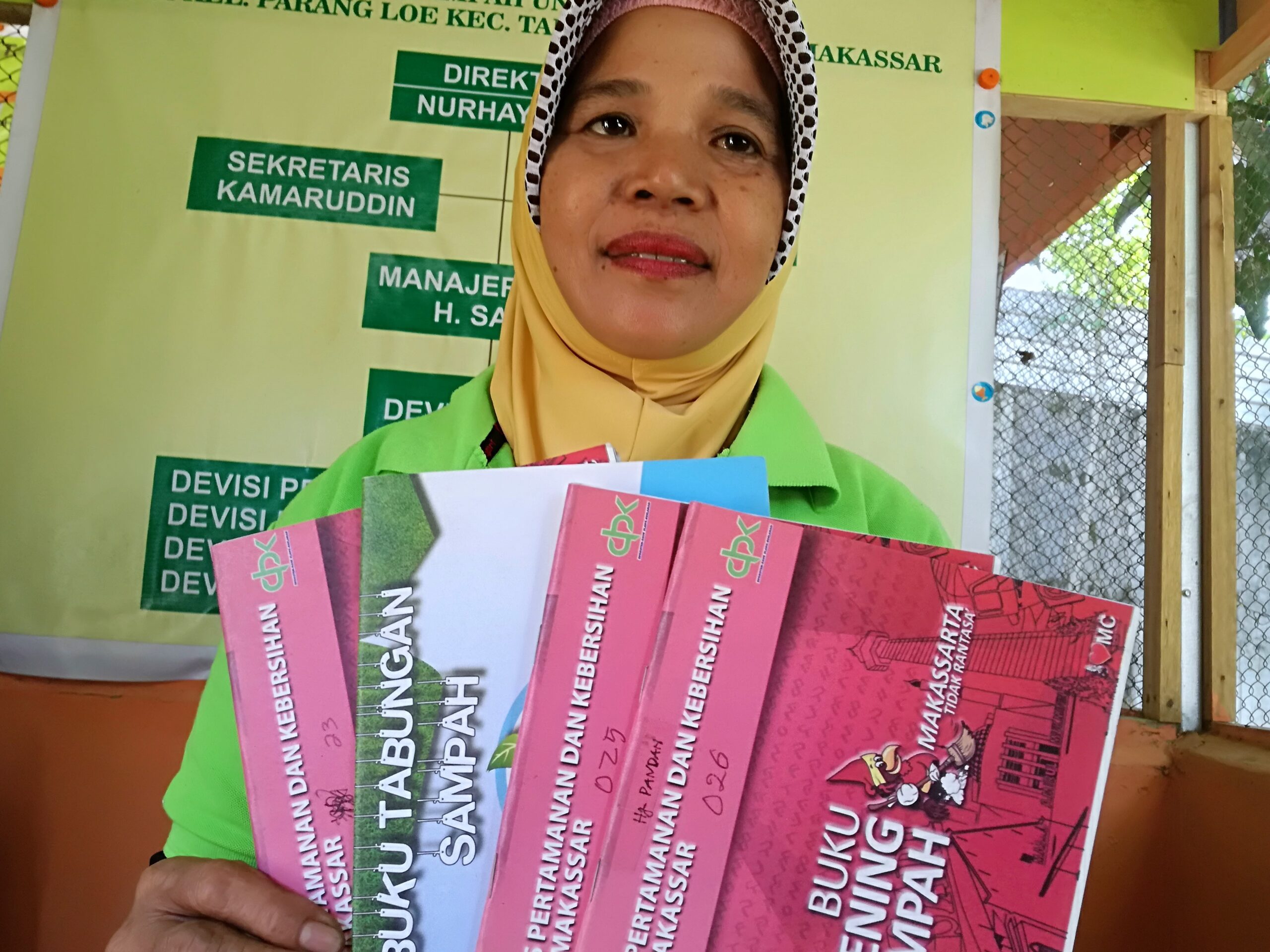 “Sekarang memang kebanyakan dijemput sampahnya. Sudah jarang ada datang ke sini untuk antar sendiri sampahnya. Jadi mereka tidak perlu repot-repot dan merasa malu datang menjual sampah. Kita bahkan jemput sampah hingga ke lorong-lorong. Kita suruh saja mereka simpan sampahnya di depan rumah, kita jemput pakai motor viar ini. Catatannya ini tetap di sini dan mereka juga punya buku nasabah. Kita langsung timbang di sana. Ada juga beberapa orang kasih kepercayaan saja. Disuruh timbang saja.”
