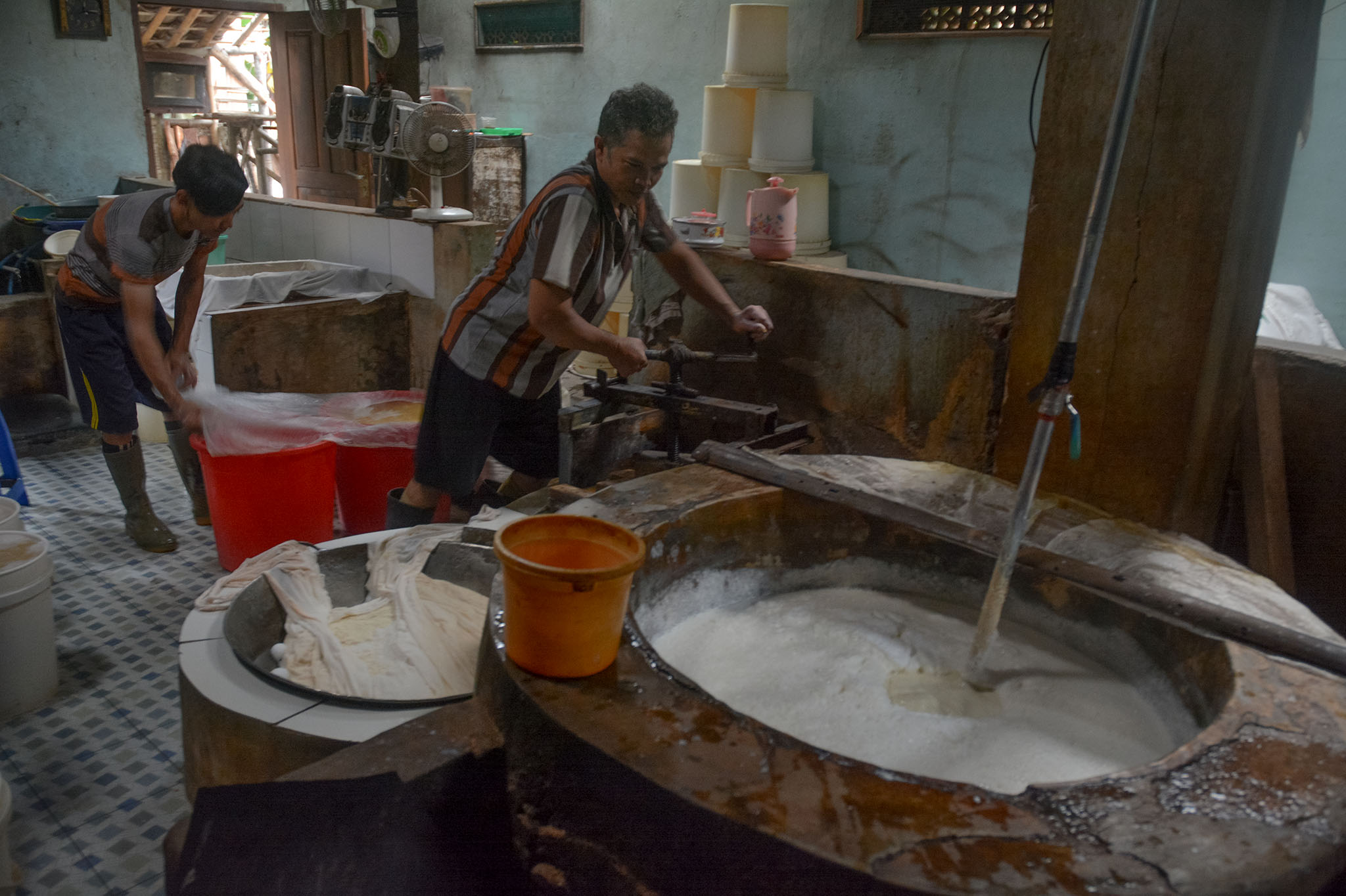 Pada ruangan dengan luas sekitar 6 x10 meter tersebut, mereka mulai bekerja. Ternyata tempat pembuatan tahu di rumah Casan telah berbeda dengan perajin-perajin lainnya. Selain relatif bersih karena tidak ada bekas kayu bakar, juga asapnya jauh berkurang.