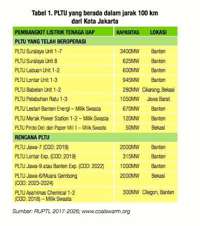 Semua PLTU ini berada di sekitar ibukota yakni Cilegon, Serang, Banten, Bogor, Bekasi, Tangerang dan Cikampek. Jika rencana ini tetap berjalan, katanya, Jabodetabek akan di kelilingi PLTU yang bakal mencekik kota ini beserta sekitar 30 juta penduduknya.