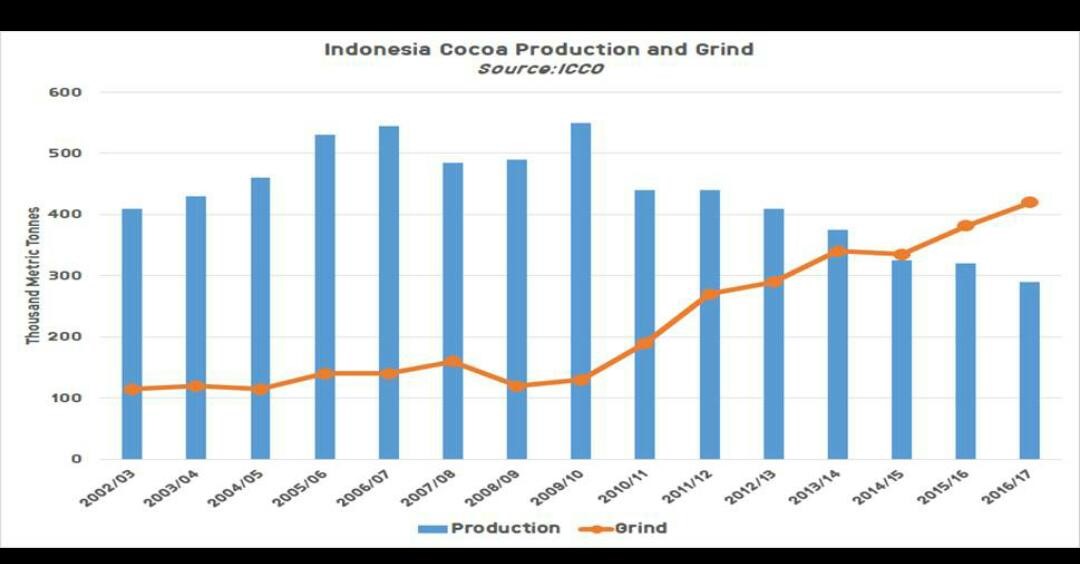 Sementara Organisasi Kakao Internasional menyebutkan produksi kakao Indonesia menurun 47 persen selama tujuh tahun terakhir menjadi sekitar 290.000 ton untuk musim panen 2016/17. Hal ini disebabkan oleh kondisi pohon yang tua, tanah yang tidak subur, serangan hama dan penyakit, hingga harga yang fluktuatif serta perubahan iklim (curah hujan tinggi).