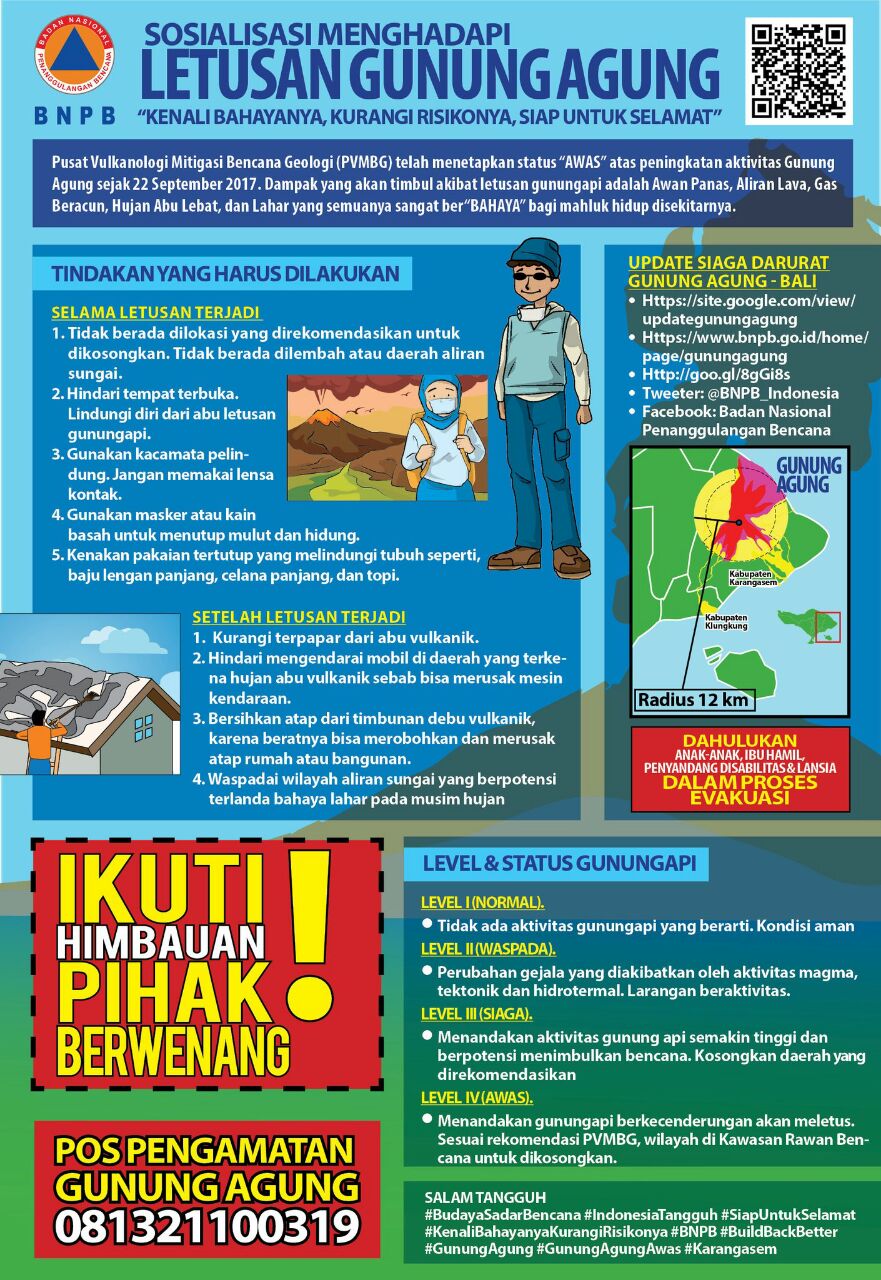 Untuk mengantisipasi segala kemungkinan dan risiko bencana maka PVMBG telah menaikkan status Gunung Agung dari Siaga (level 3) menjadi Awas (level 4) terhitung mulai 27/11/2017 pukul 06:00 WITA. Status Awas adalah status tertinggi dalam status gunungapi.