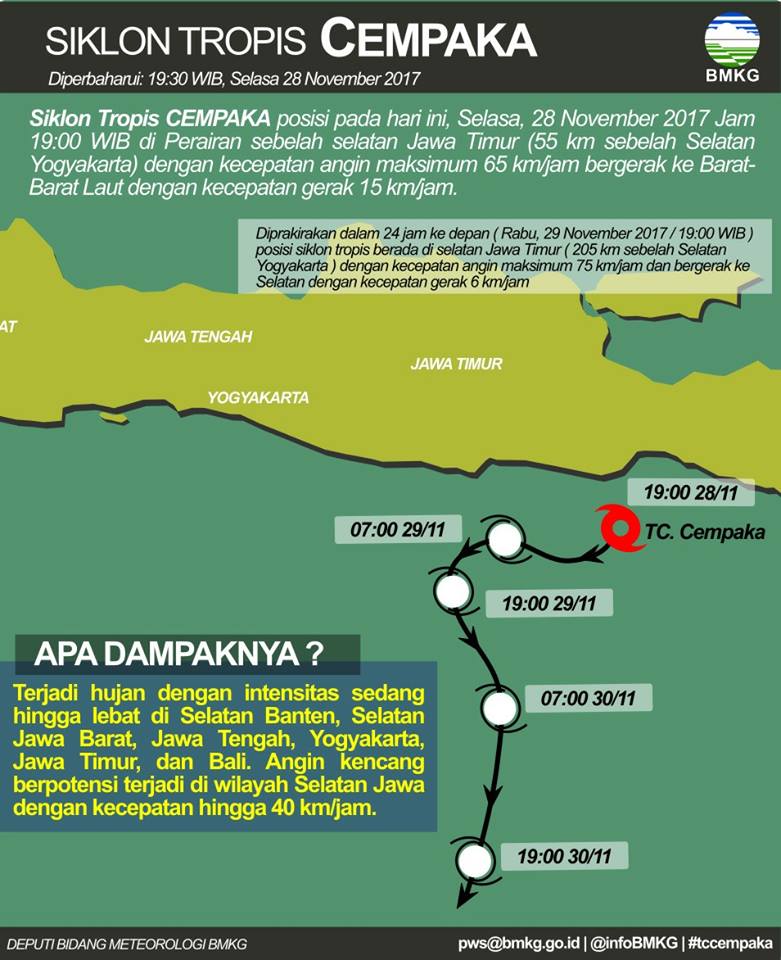 Diperkirakan, menurut Sutopo, siklon tropis Cempaka akan bergerak menjauhi wilayah Indonesia pada Rabu (29/11/2017). Namun masih memberikan dampak hujan deras dan gelombang tinggi di wilayah Jawa dan Bali. Untuk itu, masyarakat dihimbau untuk meningkatkan kesiapsiagaan menghadapi ancaman banjir, longsor dan puting beliung.