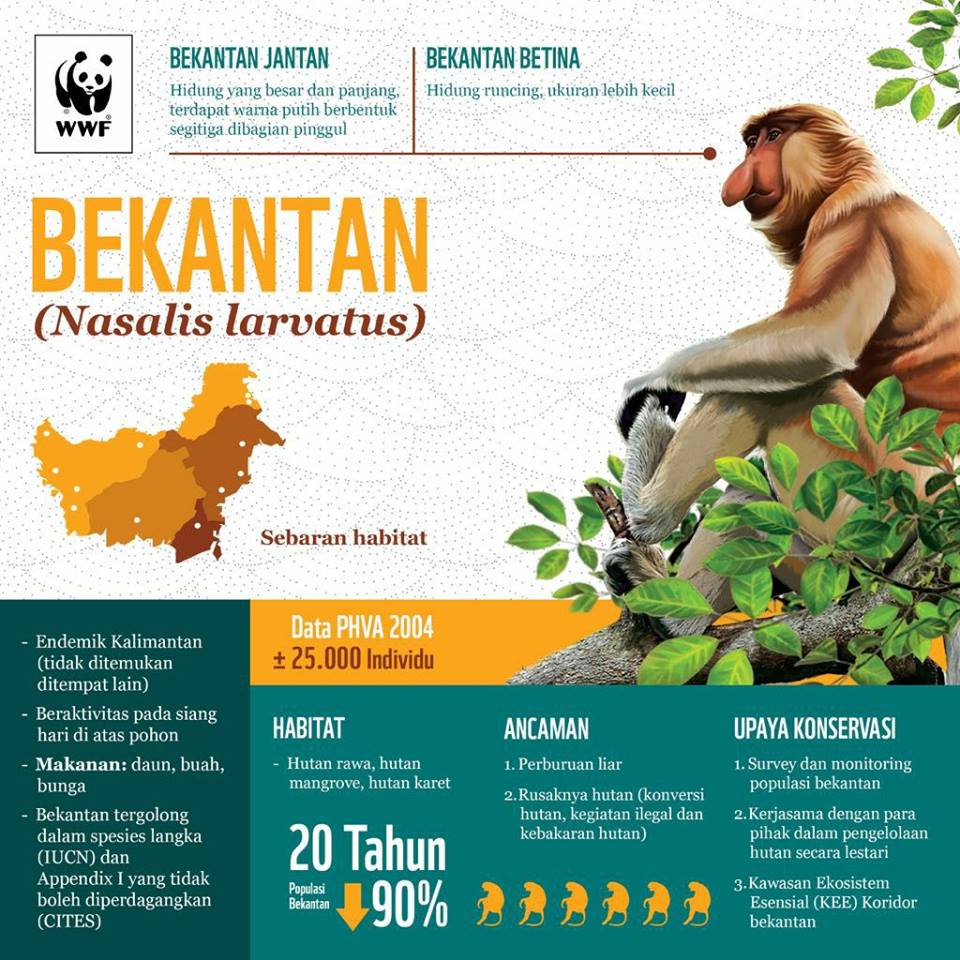 Siapa yang tak kenal bekantan? Satwa dengan nama Latin Nasalis larvatus ini dikenal luas sebagai kera Belanda berhidung mancung. Hidup di ekosistem hutan mangrove, masa depan satwa endemik Borneo ini bertengger di ujung tanduk. Konversi habitat, perburuan, kebakaran hutan, dan illegal logging menjadi penyebab utama terjadinya penurunan populasi bekantan.