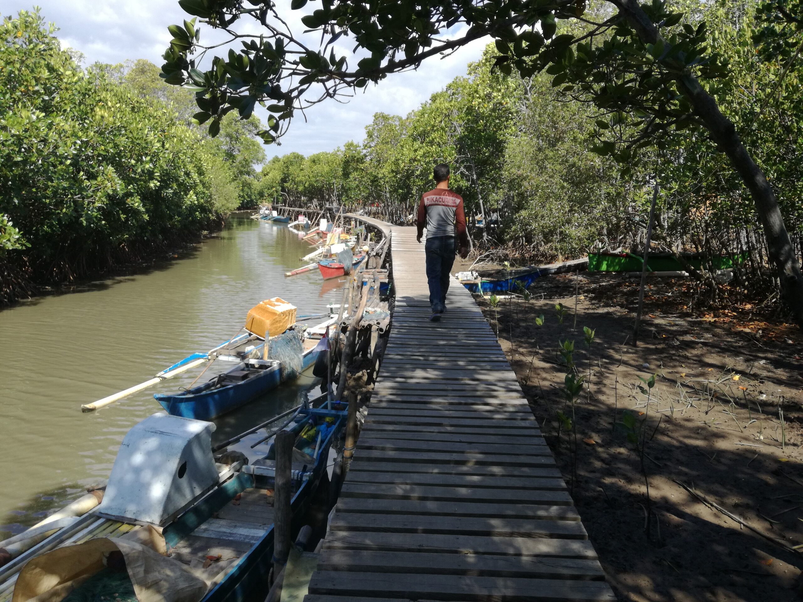 Mursalim (40) menambatkan perahunya, lalu dengan hati-hati mengikat di tiang jembatan. Pakaiannya sedikit basah, entah oleh karingat atau percikan air laut. Senyum tersungging dari bibirnya. Ia lalu mengajak kami ke pondok informasi yang tak jauh dari tambatan perahu itu.