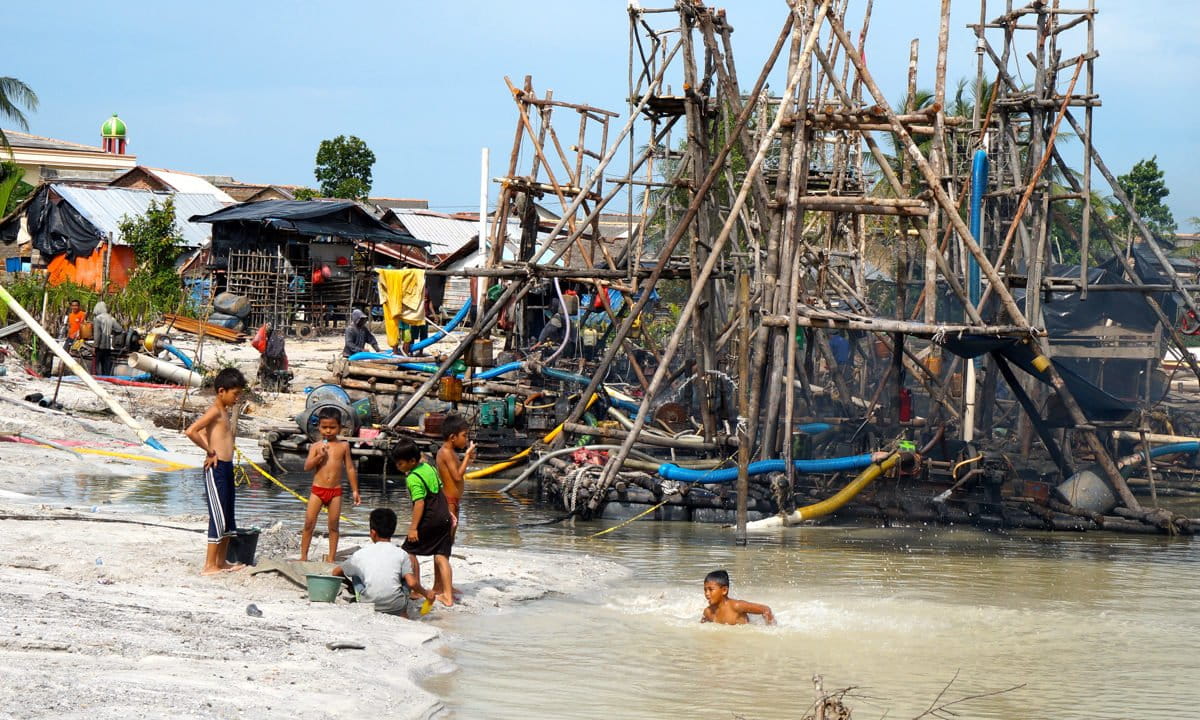 Keterangan foto utama: Ponton timah di Bangka, menyebabkan air keruh dan laut rusak. Anak-anak tanpa menyadari bahaya sekitar, main dan mandi di tepian pantai itu. Foto: Lusia Arumingtyas/ Mongabay Indonesia