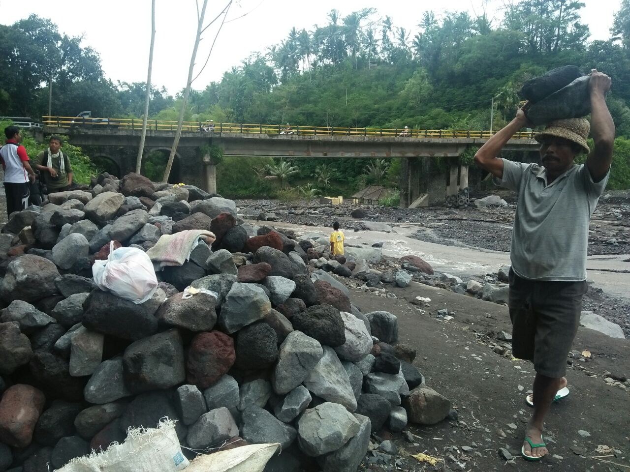 Tumpukan bebatuan terlihat makin meninggi. Sekelompok warga hilir mudik di sungai mencari batu-batu seukuran buah durian sampai nangka ini. Semua menggunakan tenaga sendiri, tanpa alat khusus.