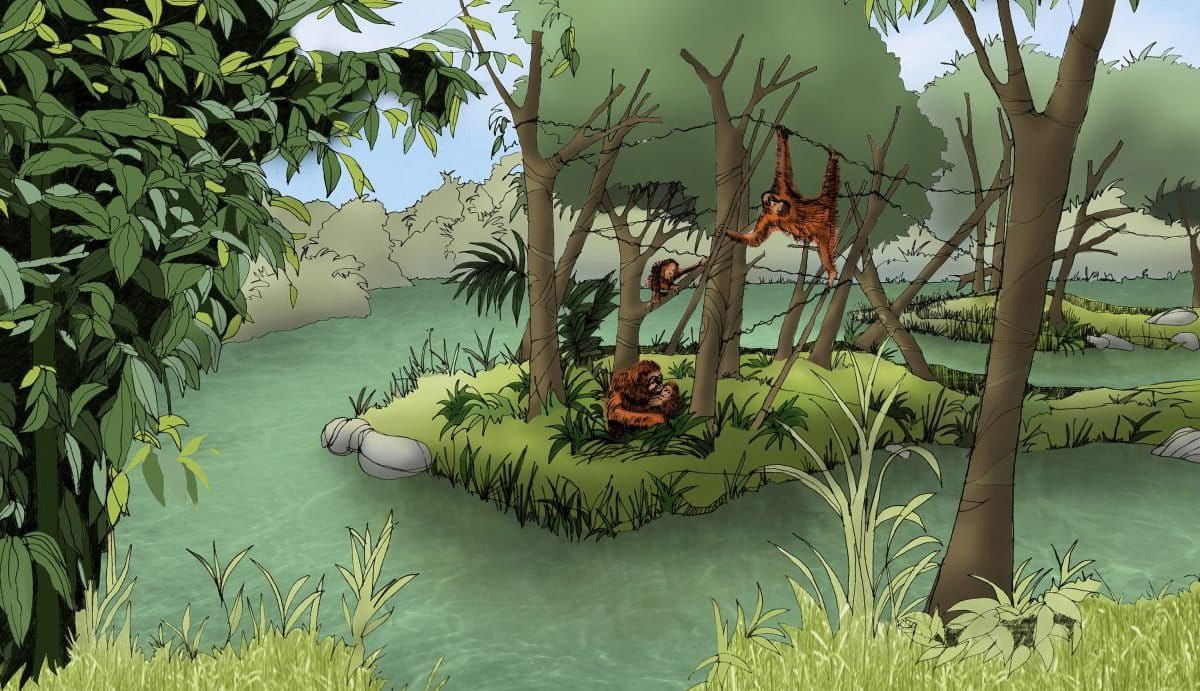 Banner: Visualisasi orangutan di pulau buatan bernama Orangutan Haven yang tengah dibangun. Sumber: Sumatran Orangutan Conservation Programme (SOCP)