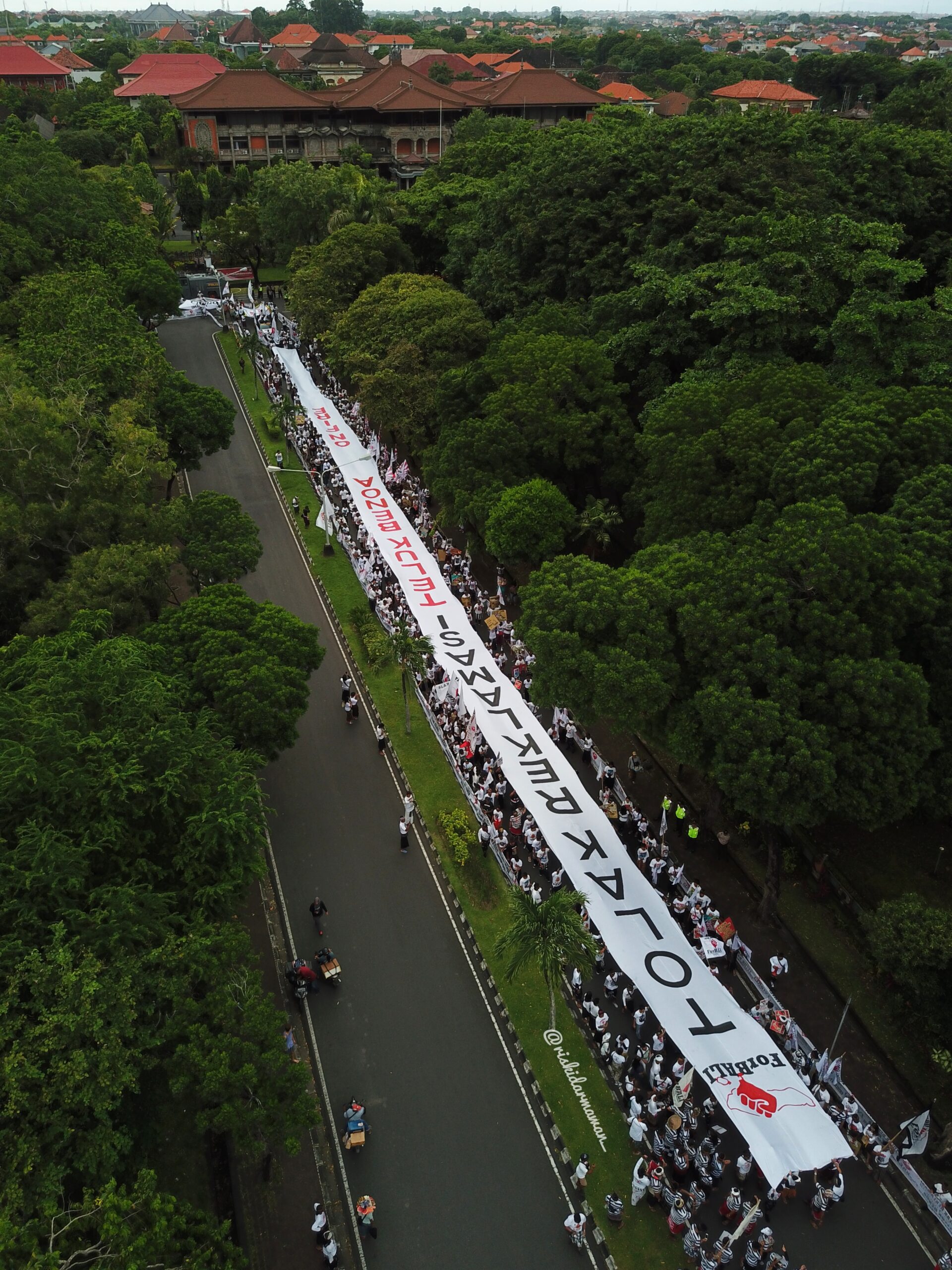 Peserta aksi yang didominasi anak muda ini memompa energinya dengan menambah amunisi aksi. Misalnya kain panjang atau lelancingan bertuliskan “Tolak Reklamasi Teluk Benoa – On Fire”. Kain ini digunakan ‘menutup’ sebagian kantor Gubernur Bali seolah menyatakan protes dan semangat tak pernah surut walau sudah 5 tahun aksi penolakan.