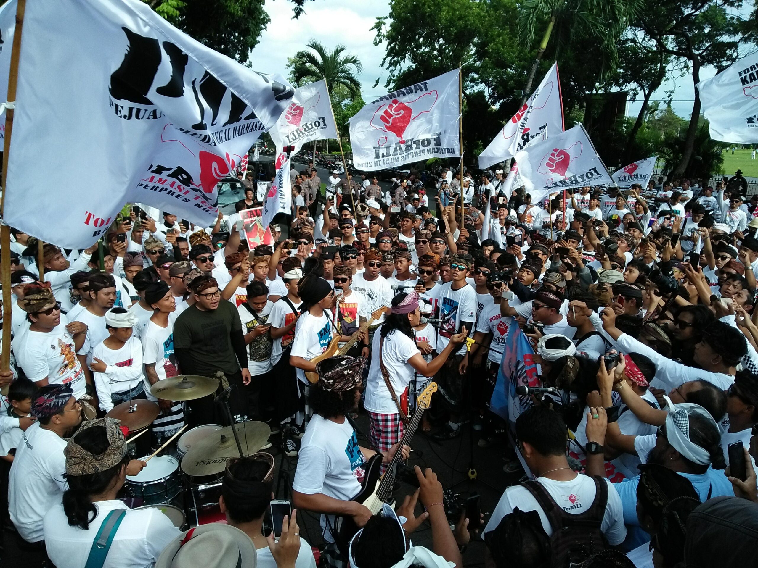 Gede Robi, vokalis Navicula menyanyikannya dalam aksi parade budaya Bali Tolak Reklamasi Teluk Benoa pada Sabtu (17/02/2018) di sekitar Kantor Gubernur Bali. Massa berkumpul setelah longmarch mengelilingi Lapangan Perjuangan Rakyat Bali Bajra Sandhi dengan barisan orang ratusan meter.
