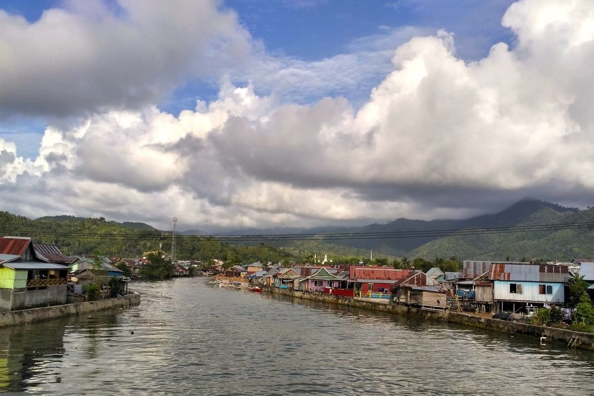 Foto tampak muka: Sungai Tueley yang melewati Kelurahan Panasakan, Kota Tolitoli, Sulawesi Tengah dengan latar belakang Cagar Alam Gunung Dako. Foto: Rosmini Rivai/Mongabay Indonesia