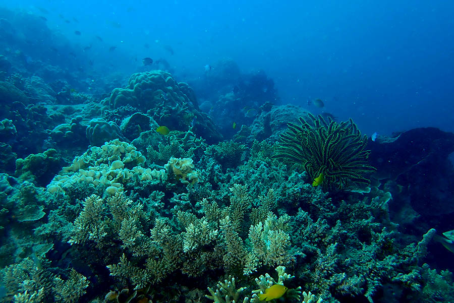 Ketika mulai menyelam, gerombolan ikan dan hamparan terumbu karang seolah menyambut kami. Namun, keindahaan bawah laut pada spot itu sedikit terganggu akibat sebagian besar terumbu karang sudah mengalami pemutihan atau coral bleaching.
