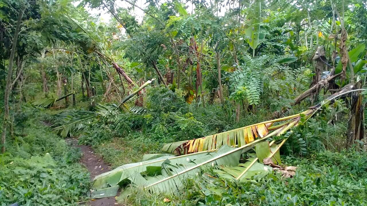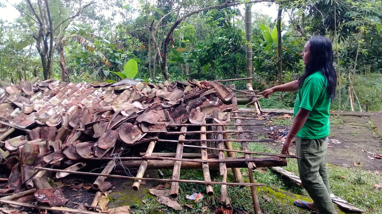 Bagian depan bangunan dari bambu, kamar mandi, dan bak penampung yang biasa dipakai menyiram tanaman rusak. Pepohonan sekeliling roboh, diduga ditebang.