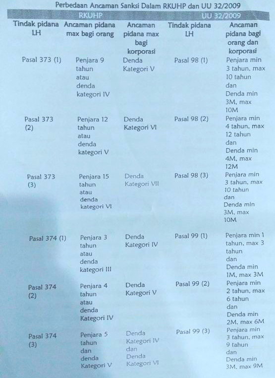 Begitu juga sanksi pidana, melalui RKUHP ini memperlihatkan bagaimana hakim makin tak memiliki pedoman batas minimal hukuman, hanya pakai maksimal hukuman. Sedangkan, dalam UU PPLH, sanksi pidana memiliki masa minimum dan maksimum.