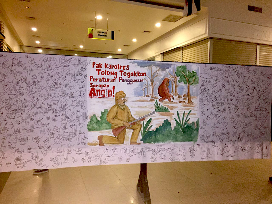 “Petisi ini ditujukan untuk Kapolres Ketapang agar memperketat penggunaan senapan angin,” tukas Shafa Fakhir, ketua panitia, 27 Maret 2018 lalu. Kegiatan ini dirangkaikan dengan peringatan Hari Hutan Internasional, bekerja sama dengan Yayasan International Animal Rescue (IAR) Indonesia. Aksi mereka bukan tanpa alasan, ada Peraturan Kepala Kepolisian RI Nomor 8 tahun 2012 sebagai rujukan.