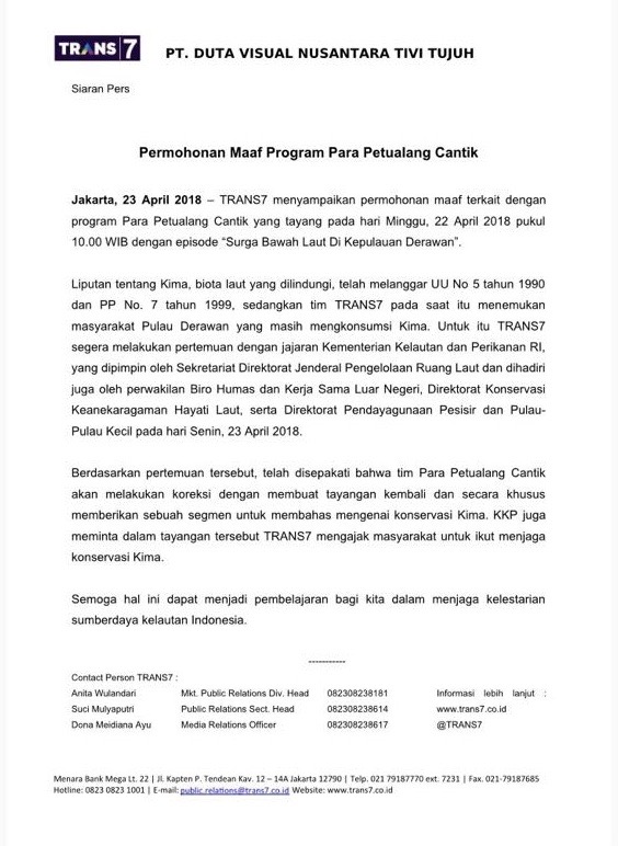 Pihak @TRANS7 menyampaikan permohonan maaf dan menyesal krn ketidak tepatan penayangan @ppc_trans7 pd edisi Derawan 3 mengkonsumsi Kima dan akan mengklarifikasi tayangan tersebut pd edisi berikutnya @kkpgoid @susipudjiastuti @DitjenPRL @satyamurti pic.twitter.com/sp0EF68qLJ