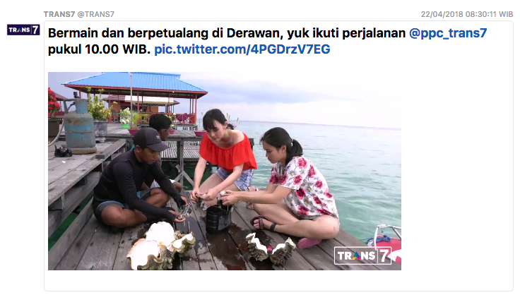 Kontroversi penayangan acara Para Petualang Cantik (PPC) episode “Surga Bawah Laut di Pulau Derawan” yang tayang di stasiun televisi Trans7 pada Minggu (22/4/2018) pukul 10.00 masih terus bergulir. Meski pihak manajemen televisi sudah memuat pernyataaan permintaan maaf, tetapi banyak pihak yang menuntut manajemen televisi untuk segera mengambil tindakan lebih nyata, seperti pencabutan tayangan tersebut dari sosial media atau televisi daring milik mereka.